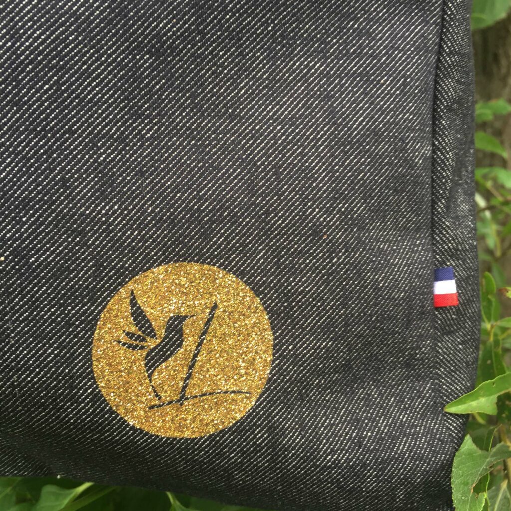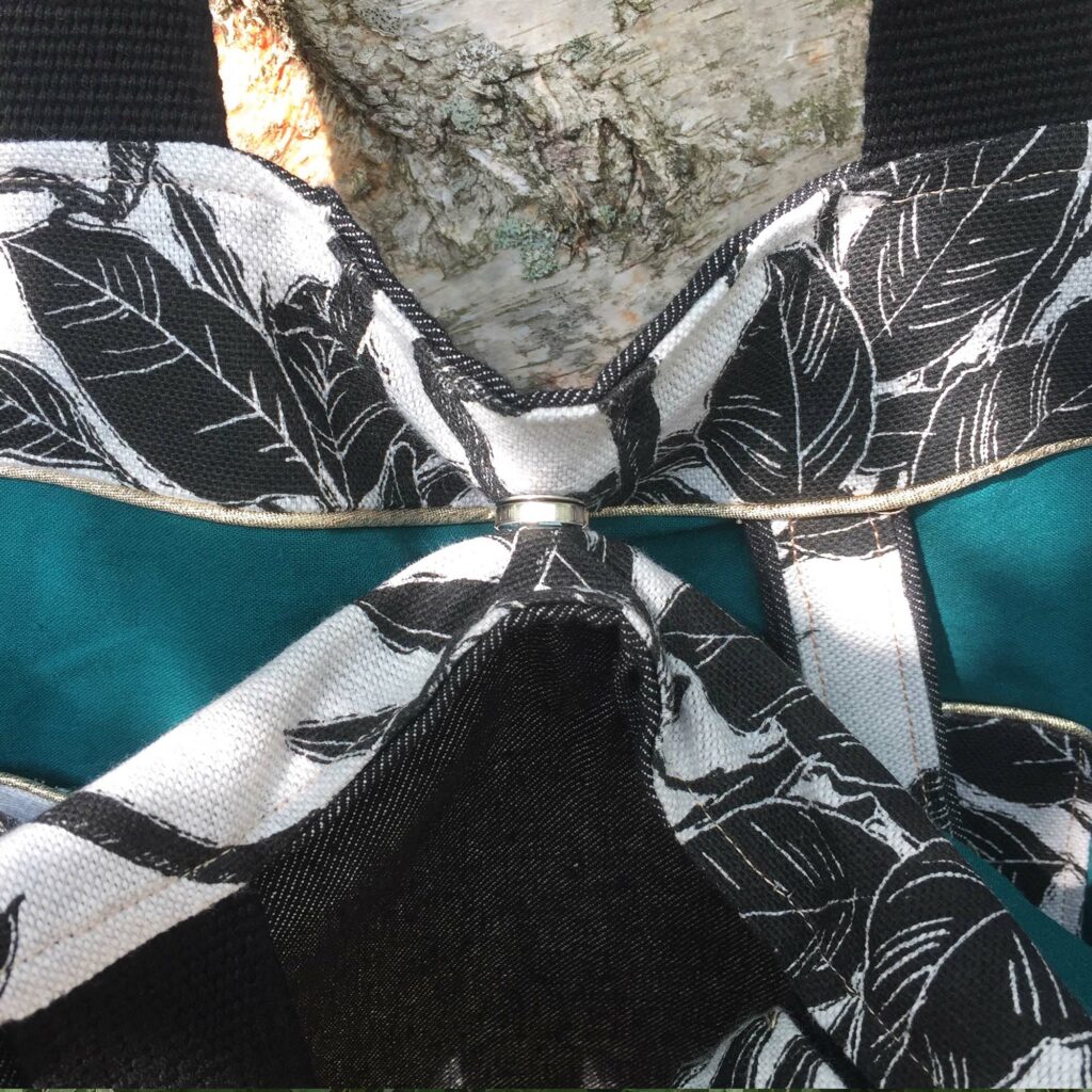 Coton denim noir en extérieur (33,3% Coton bio 33,3% Coton recyclé 33,3% Polyester recyclé bouteilles), associé à un tissu imprimé singe (Toile savoie, 90% coton 10% polyester).