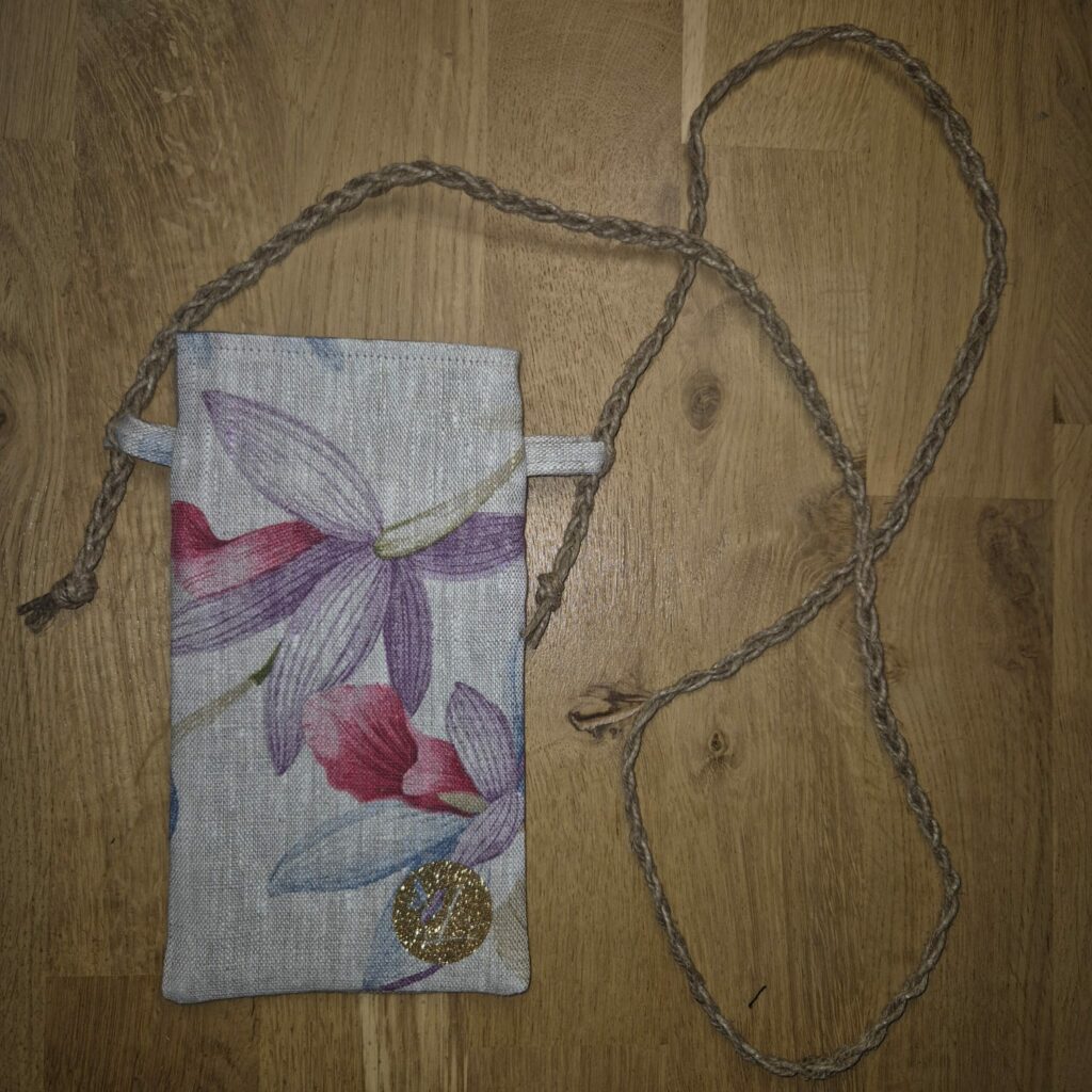 Version Orchidées : recto en Lin imprimé, verso en lin naturel, doublure en percale de coton violine (revalorisation de stock dormant issu d’une grande maison de linge de lit), sangle en corde tressée (revalorisation d’un stock dormant de corde), zip noir