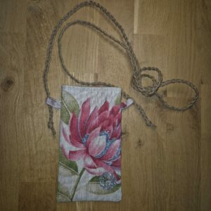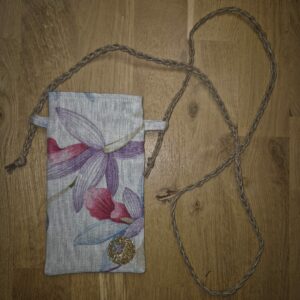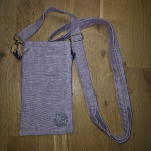 Version Violet : recto/verso en Lin uni violet, doublure en coton imprimé fleuri (revalorisation d’un stock dormant), sangle réglable en lin, zip noir