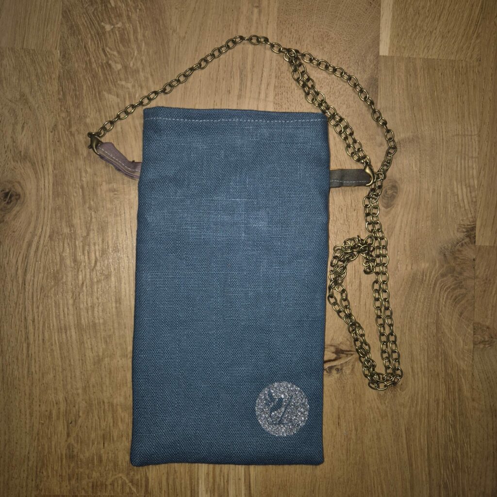 Version Bleu paon : recto/verso en Lin uni bleu paon, doublure en percale de coton imprimé bubble (revalorisation de stock dormant issu d’une grande maison de linge de lit), sangle en chainette metal, zip noir « cette version a trouvé preneur, mais je peux la reproduire sur demande sous 2-3semaines »